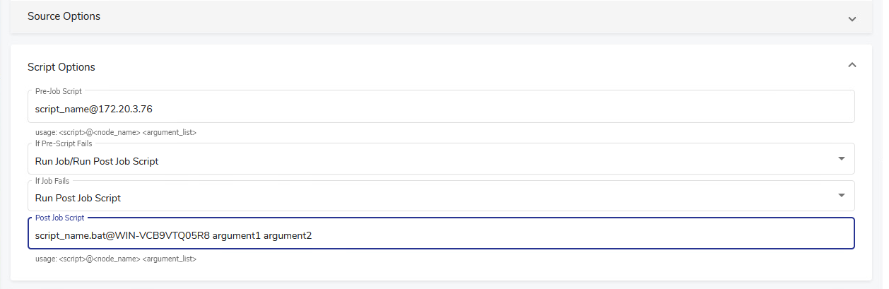 For detailed information about pre- and post-job scripts, including all valid definitions, see Pre-Scripts and Post-Scripts.