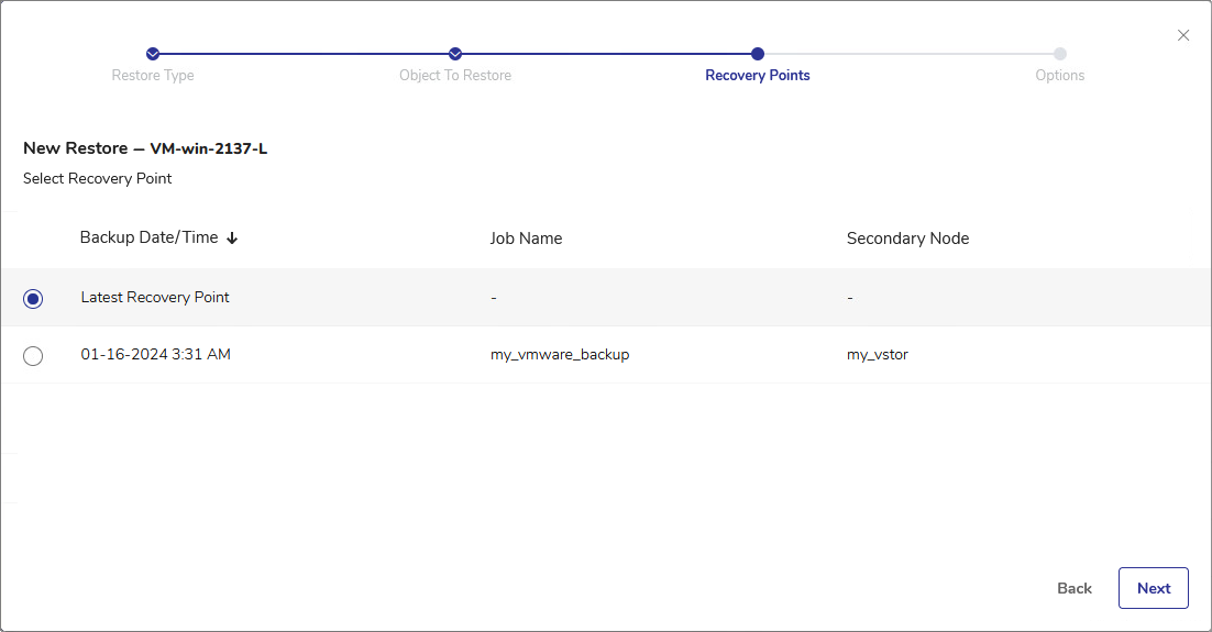 1. In the Recovery Points step, select the recovery point to restore. You can select the Latest Recovery Point or either one of the other recovery points in the list.