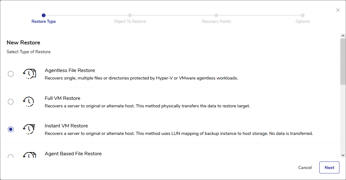 In addition to virtual machines, you can also restore specific files or directories in them. For more details about restoring files, see Agentless File Restore.
