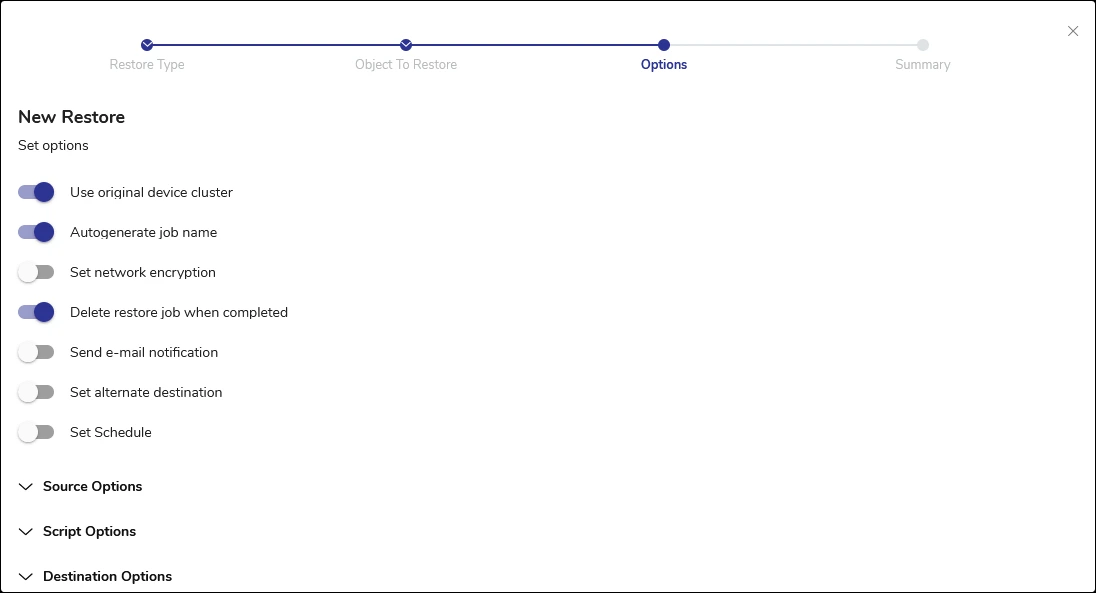 - Specify job options. This job can be tailored to meet specific recovery needs through a variety of settings and parameters.