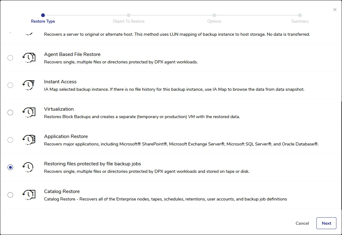 - Select Restoring files protected by file backup jobs and click Next.