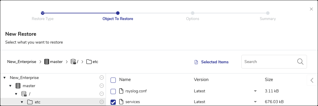 - A list will appear showing all files and directories backed up by previous file backup jobs. Select the files or directories you wish to restore and click Next.