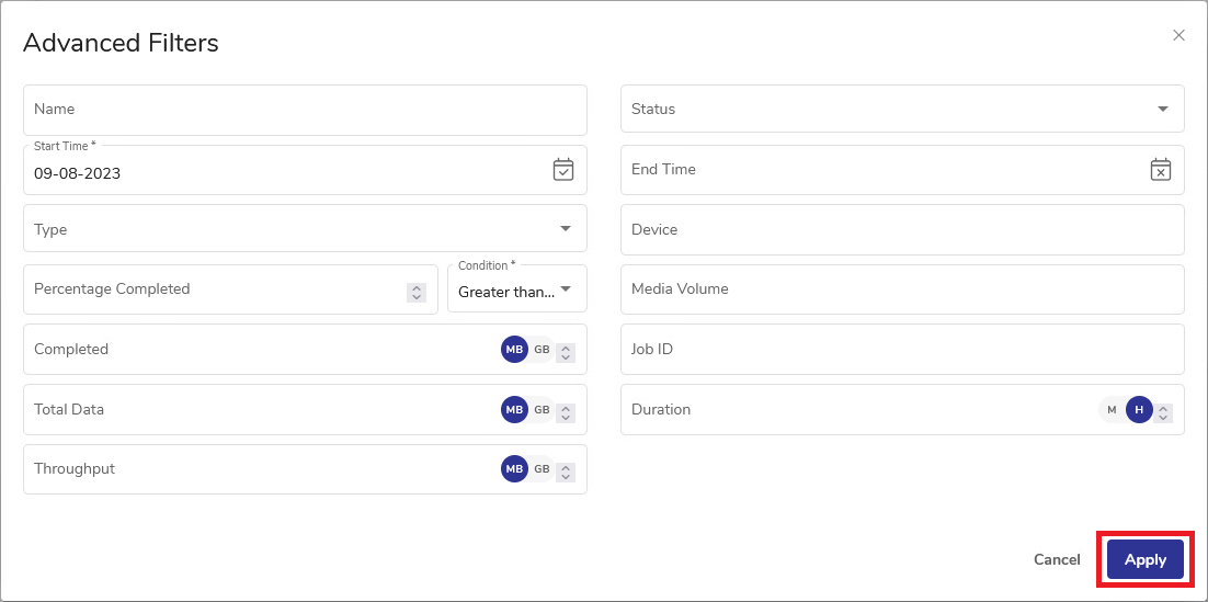 - Use the available options as needed to filter the required items. Click Apply.