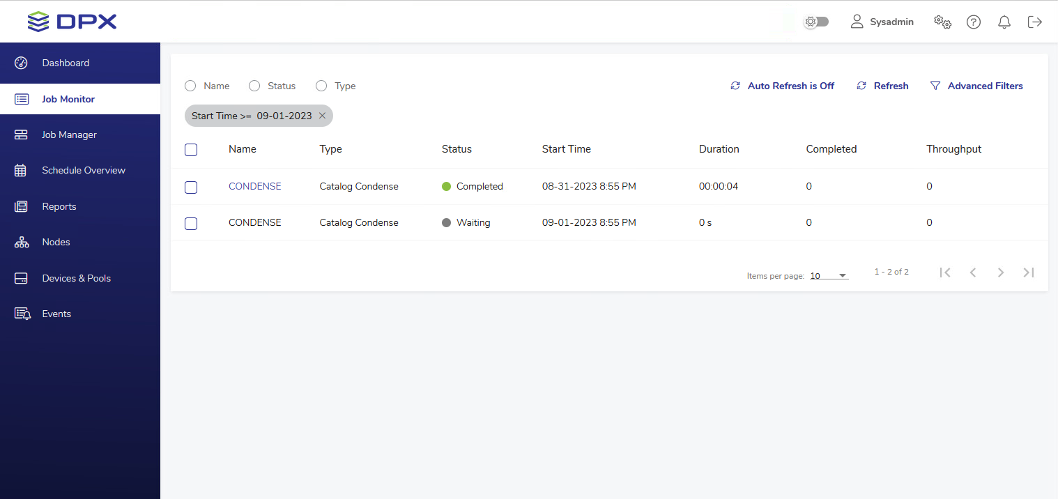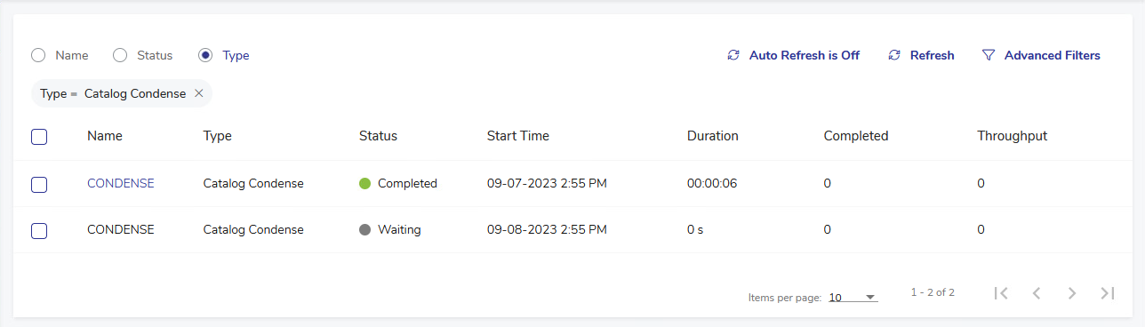 Note also the Items per page value and navigation buttons at the bottom of the list, which can be useful when managing the display of many jobs.