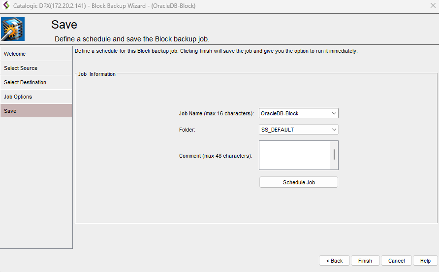 - In the final Save screen, you must enter the Job Name (max. 16 characters) and specify the Job Folder to store the job in (the default folder is SS_DEFAULT). You may also add a comment to the job definition or set up a schedule (See Scheduling a Block Backup Job).