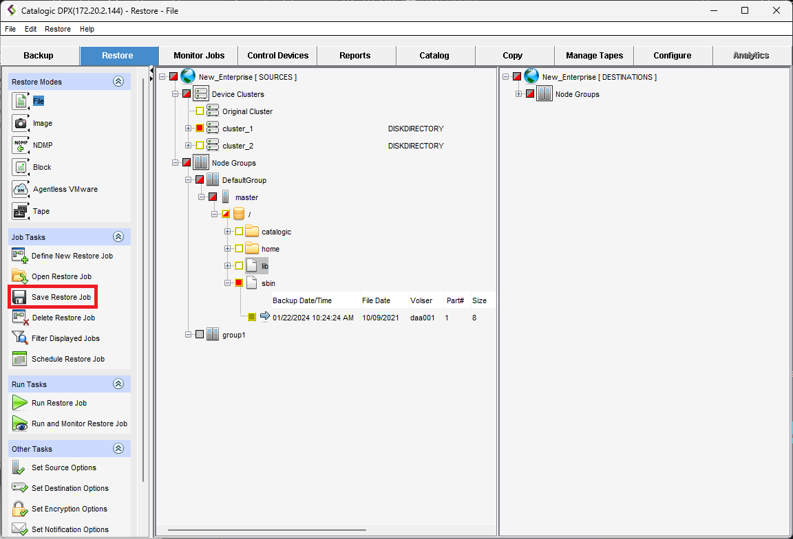 1. Select the source (a previously created file backup) and the destination for your restore job. Then, click Save Restore Job.