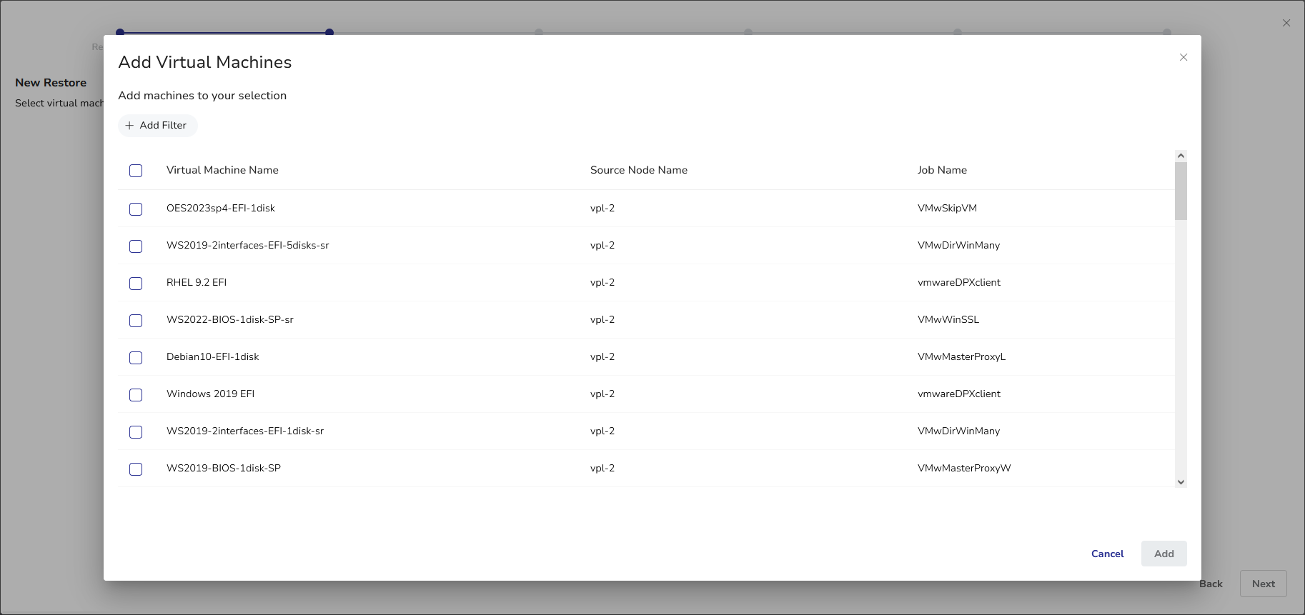 The Add Virtual Machines dialog will close and the Objects to Restore view will be populated with the selected VMs.