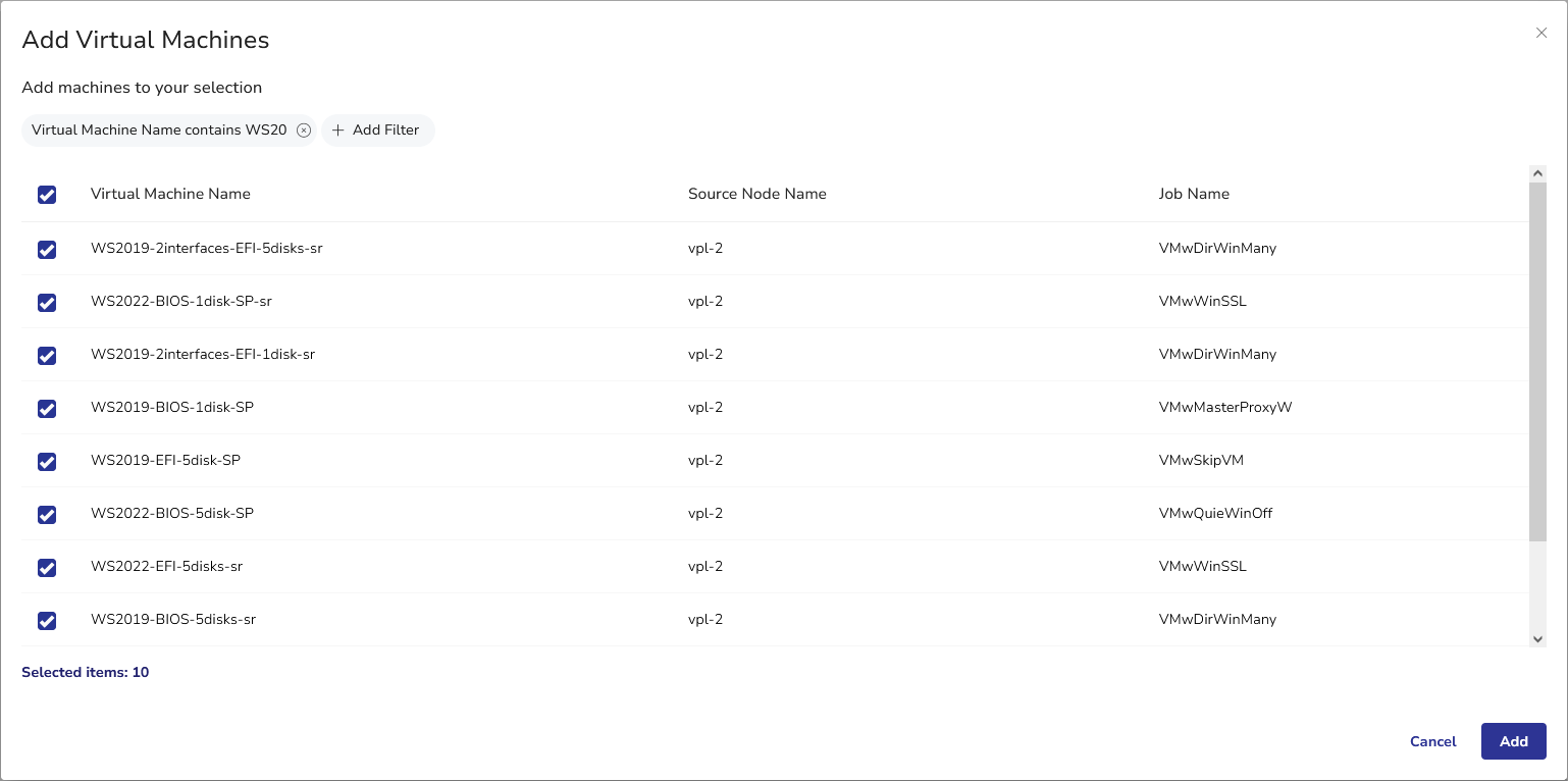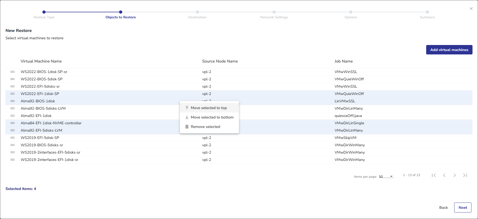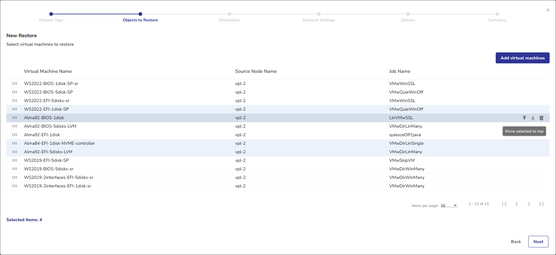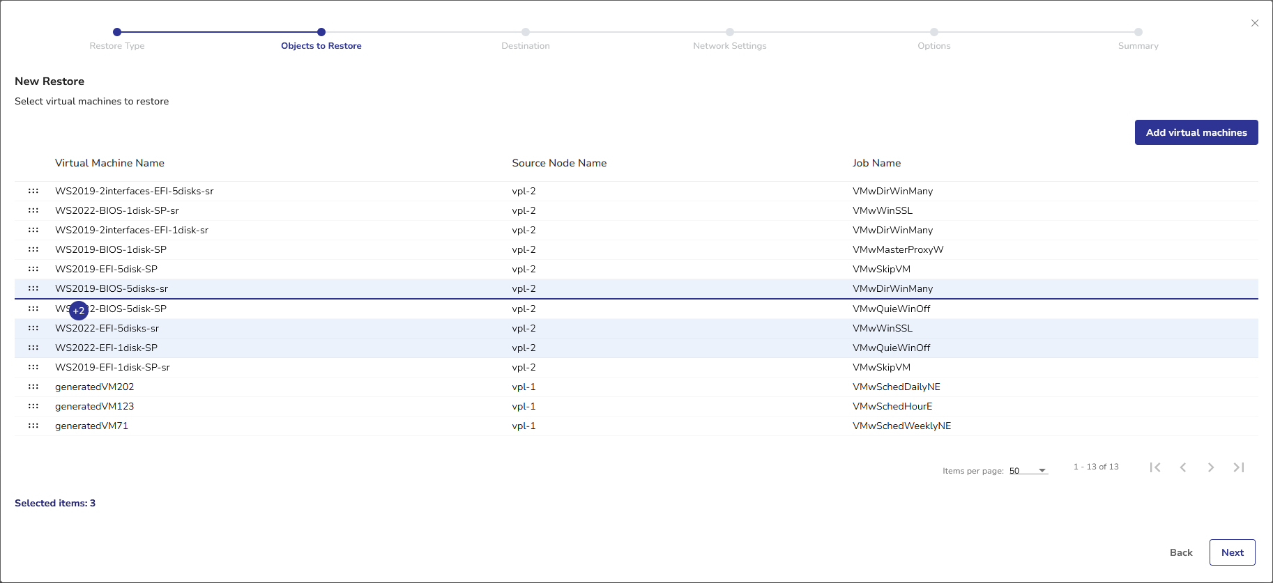 1. The Selected items value at the bottom of the list indicates the total number of VMs selected within the current restore job definition. If you want to add more VMs to the Objects to Restore view, click the Add virtual machines button in the upper right corner.