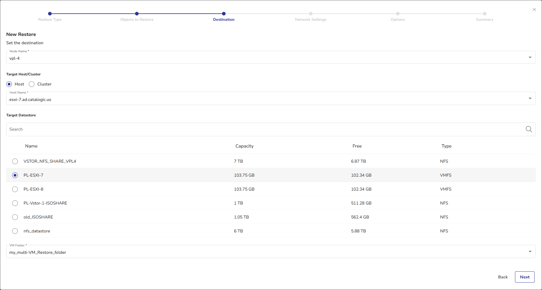 3. Select the target datastore from the list. You can narrow down the displayed list by searching by the datastore name, or sort the list by Name, total Capacity, Free capacity or Type.