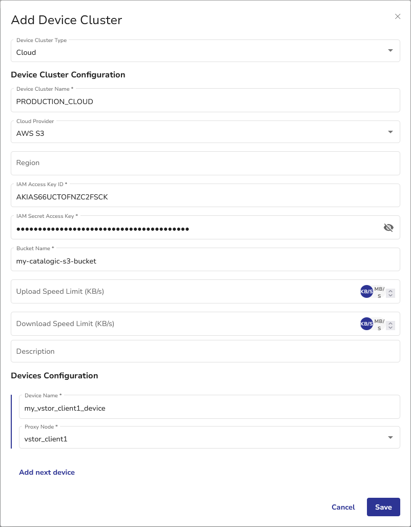 A device cluster is a logical grouping of non-tape library (standalone) backup devices. Follow these steps to add and configure AWS S3 for Agentless VMware and Block archiving.