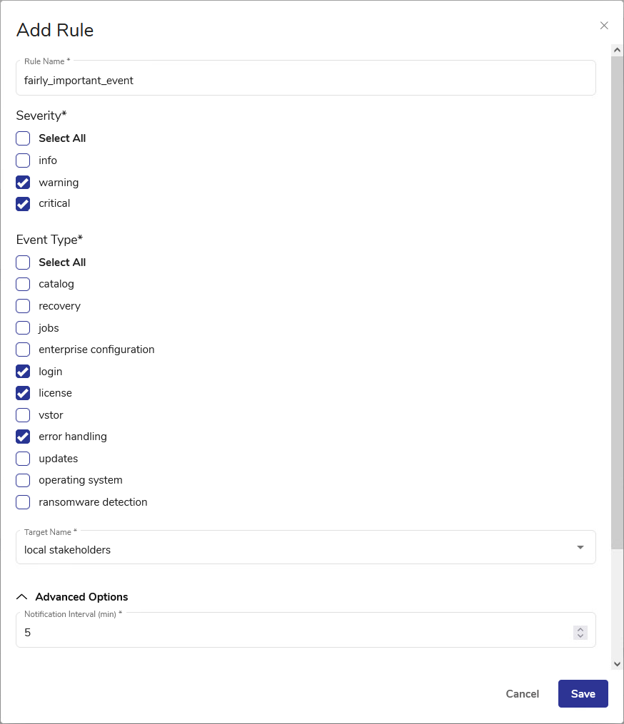 - Select the Severity of events that will be reported in the notification. Unchecked severity levels will be ignored by this rule. Multiple selection is possible.
