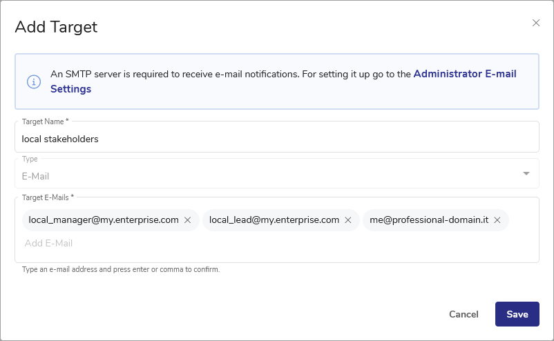 - Specify Target E-mail. Multiple addresses are handled – just separate them with a comma or press Enter to confirm each e-mail address.