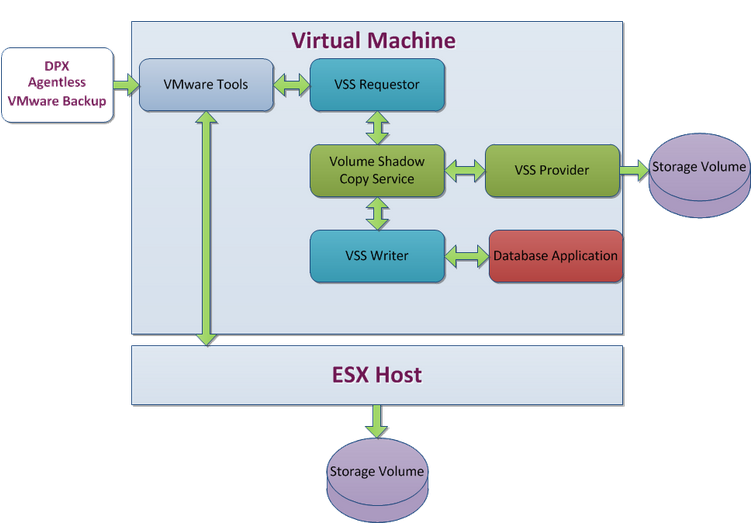 Catalogic DPX uses VMware tools that direct the Microsoft VSS to invoke the snapshot process and quiesce the VSS-aware applications. VSS interfaces with the applications and Windows OS to quiesce all of the transactions at a specific point in time. The triggering of VSS writers starts a VSS freeze and halt the transactions of the database application to create a consistent view of application data before taking a VM snapshot. Using the VSS writer, the data for the application is in the same state as if the application was closed normally. This ensures that there are no unfinished database transactions or incomplete application files during backups.