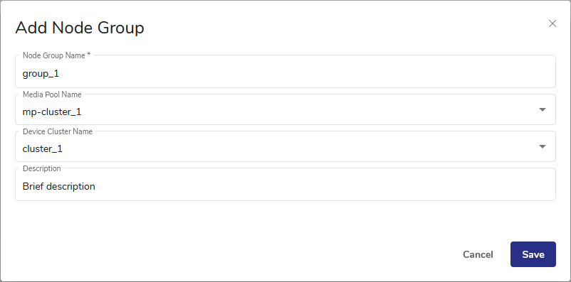 • A device cluster is a set of storage devices, such as tape drives. If there are no device clusters or tape libraries in the pull-down menu, you can edit the node group later to add one.