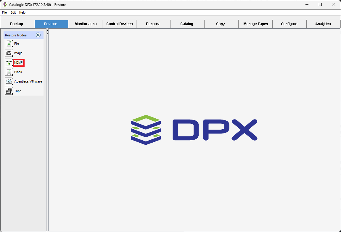 - In the main desktop interface window, go to the Restore tab, and from the Restore Modes section in the task panel, choose NDMP.
