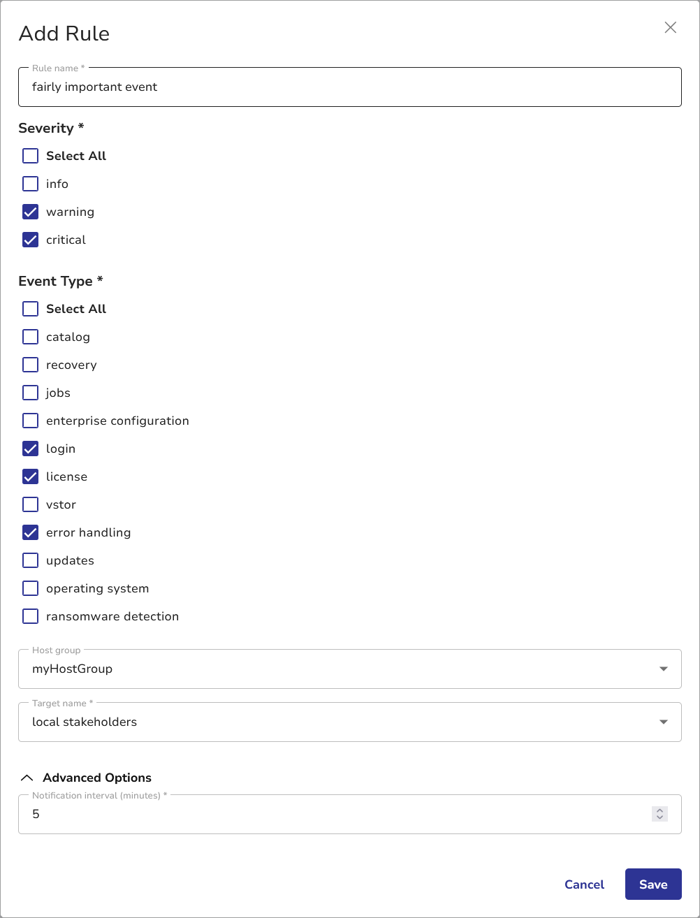 1. Select the Severity of events that will be reported in the notification. This rule will ignore unchecked severity levels. Multiple selection is possible.