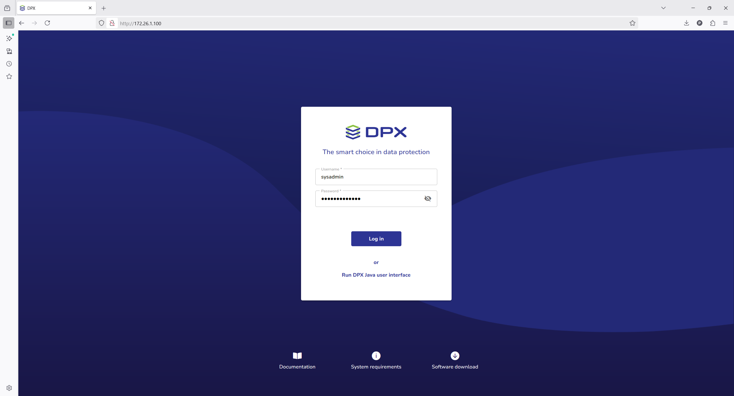 From this screen, you can also launch the classic desktop interface, by clicking the Run The DPX Java User Interface button below the Login button. See Launching the Catalogic DPX Master Server desktop interface for more details.