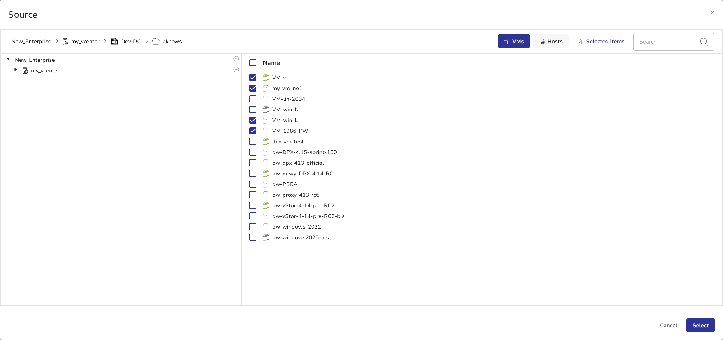- Click Add Source in the SOURCES pane to specify which volumes you want to back up. The Source selection dialog will appear. Select the desired VMs and click Select.