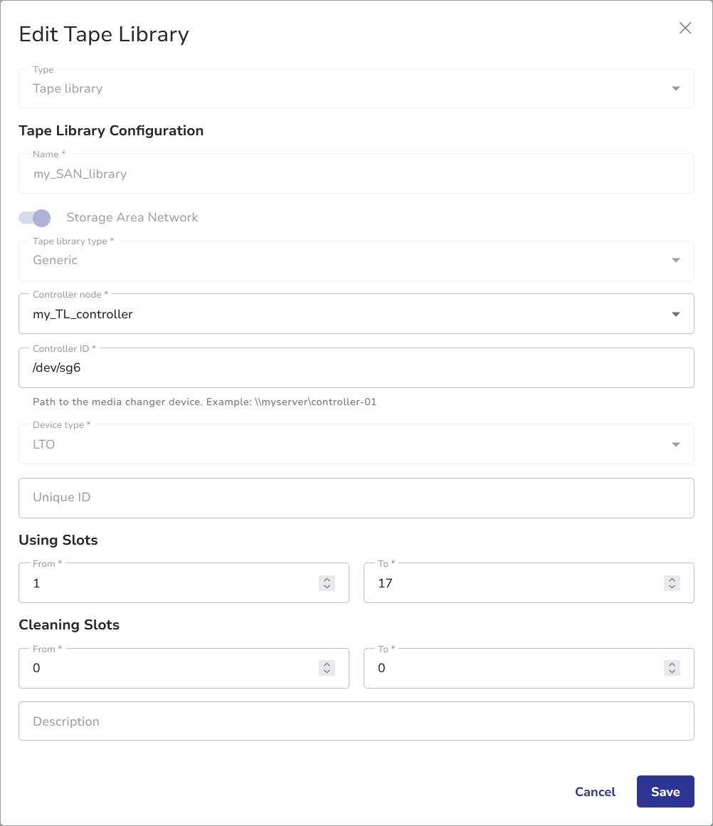- Click the name of the tape library you want to edit to open the EDIT TAPE LIBRARY dialog pane.