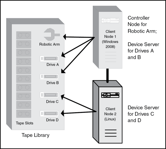 For a given tape library, each tape drive and the media changer need to communicate with a computer, or node, in the Enterprise. A node that communicates with a tape drive is referred to as a device server. The node that communicates with and controls the media changer is referred to as the controller node. (A controller node is a special type of a device server.) The following diagram illustrates these concepts: