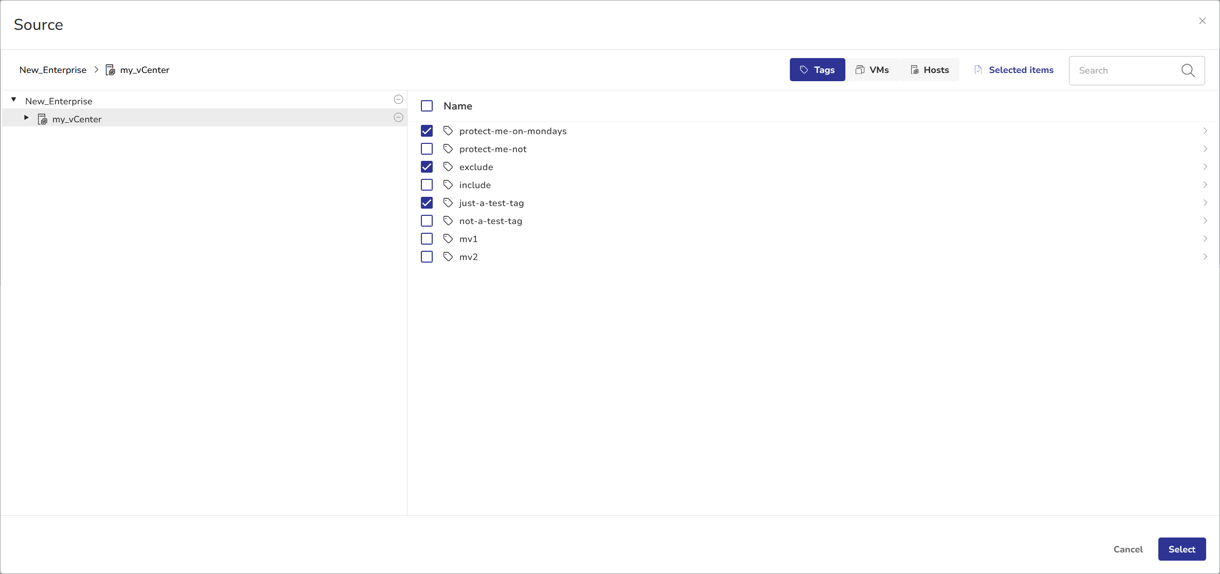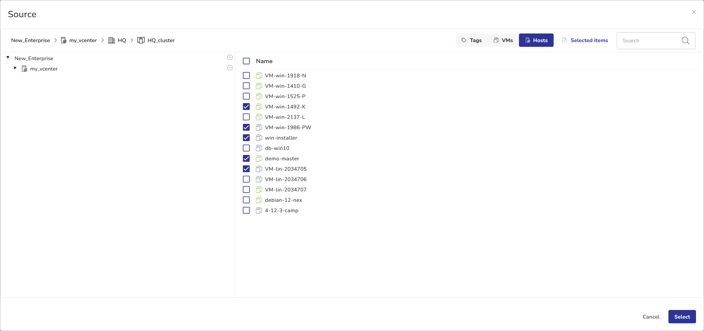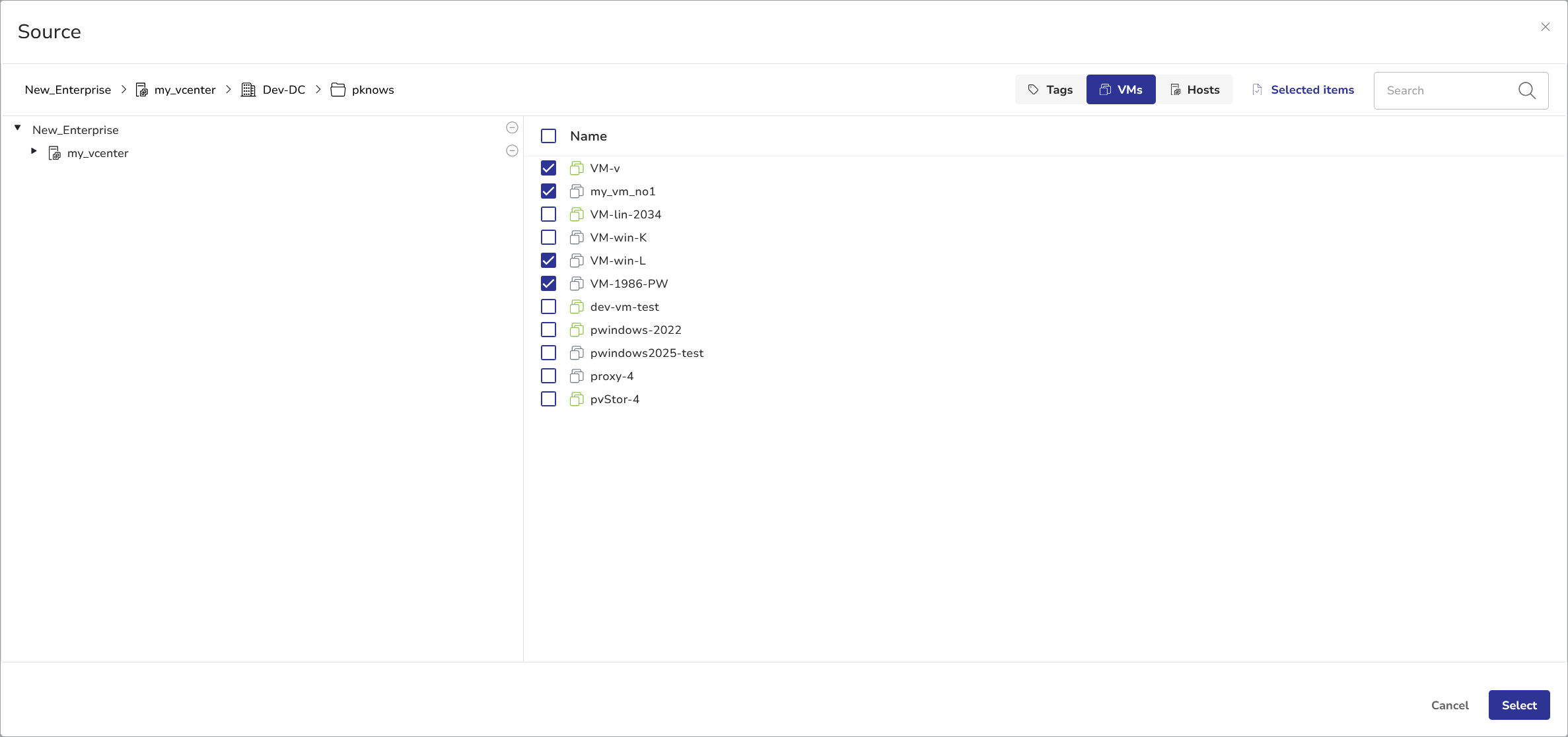 - Click Add Source in the SOURCES pane to specify which volumes you want to back up. The Source selection dialog will appear. Select the desired VMs and click Select.