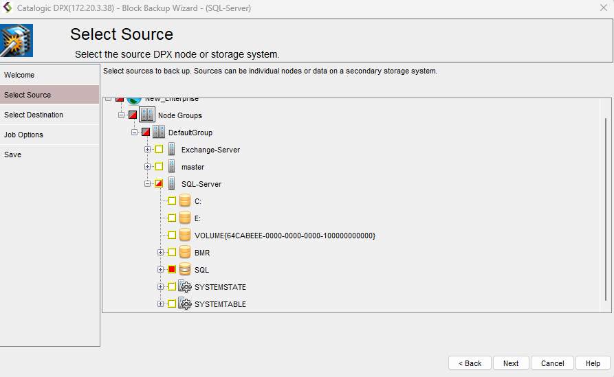 - Click Add Source in the SOURCES pane to specify which volumes you want to back up. DPX detects SQL Server installations through registry settings and the VSS (Volume Shadow Copy Service) framework. You will see a separate virtual object for every SQL Server database, indicating that DPX can perform application-consistent backups. Select your SQL Server and click Select.