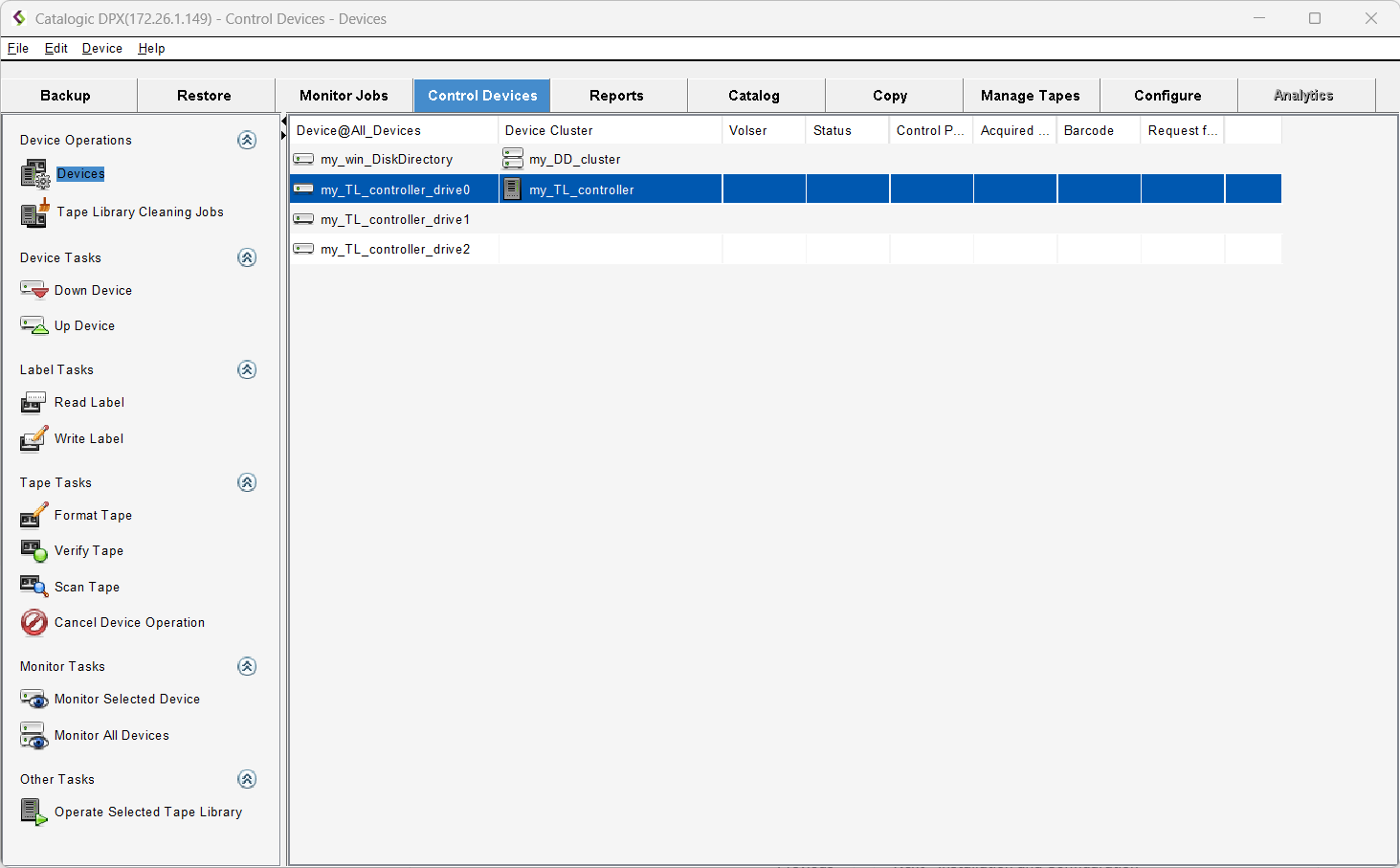 The Control Devices resource tree displays the hierarchical structure of the device clusters, tape libraries, and devices.