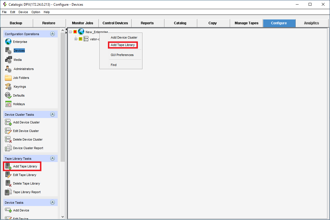 - In the left pane, select the Enterprise to which you want to add the tape library and do one of the following: