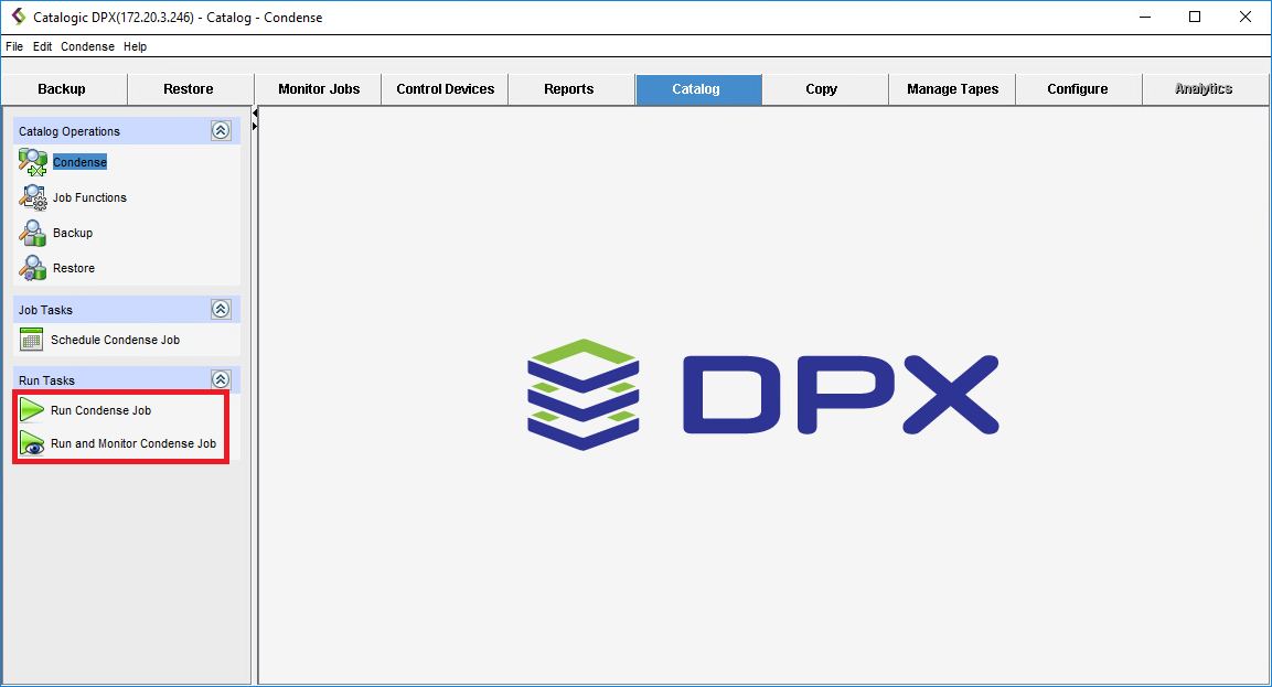 In the task panel, click Run Condense Job or Run and Monitor Condense Job. The Catalog Condense job runs. If you select Monitor, you can monitor the job while it runs.
