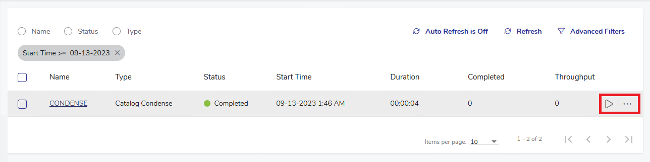 - Hover over the Condense job record. Two buttons will appear on the right end of the record. Click