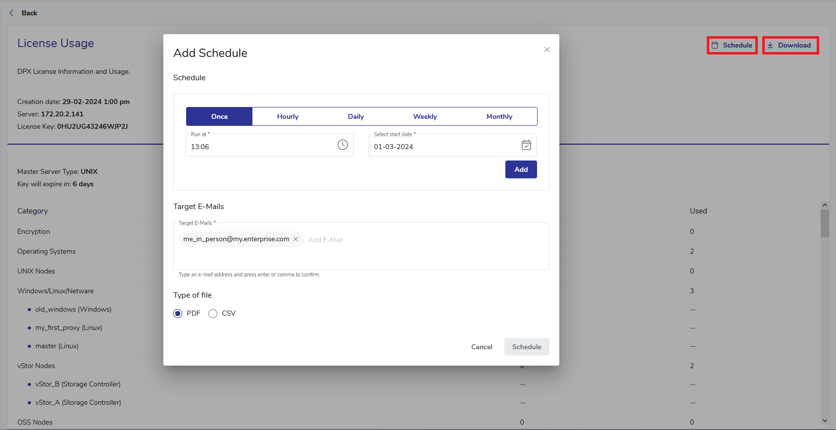 You can also use Reports to view detailed license usage information. Click License Report – you will be taken to the Reports section. You may download the data or schedule regular report generation using the buttons in the upper right corner.