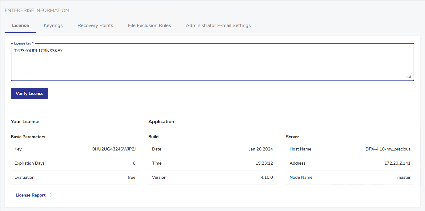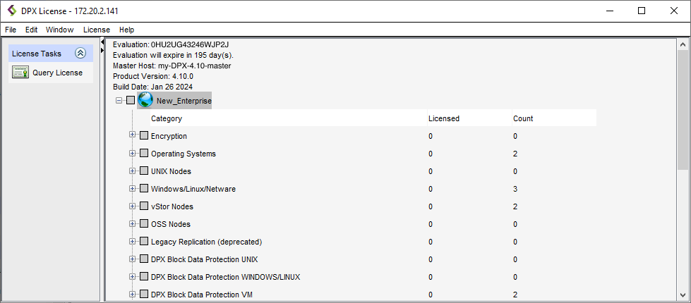 The out-of-box version of DPX Master Server comes with the evaluation license which is valid for 30 days. To keep using DPX beyond that date, you need to update the license. Moreover, you have to renew the license when the current one is expiring or after you purchase a new license for additional features, such as block storage capacity, the number of CPU sockets, etc. Contact your account manager for detailed information about the Catalogic DPX license plans.