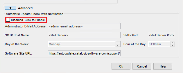 1. Additionally, you can configure the advanced options for automatic update checking with notification emails every week, after checking the Disabled. Click to Enable field: