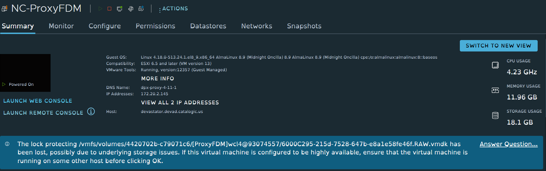 2. Click the virtual machine name to view the details. In this case, volumes have been manually removed while the VMs were running.\