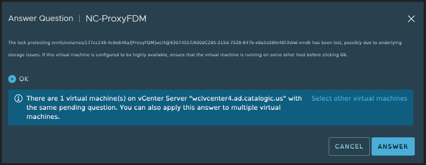 4. Click Answer to confirm the OK selection. Note that you can do it for all virtual machines facing the same issue at once, by clicking Select other virtual machines.