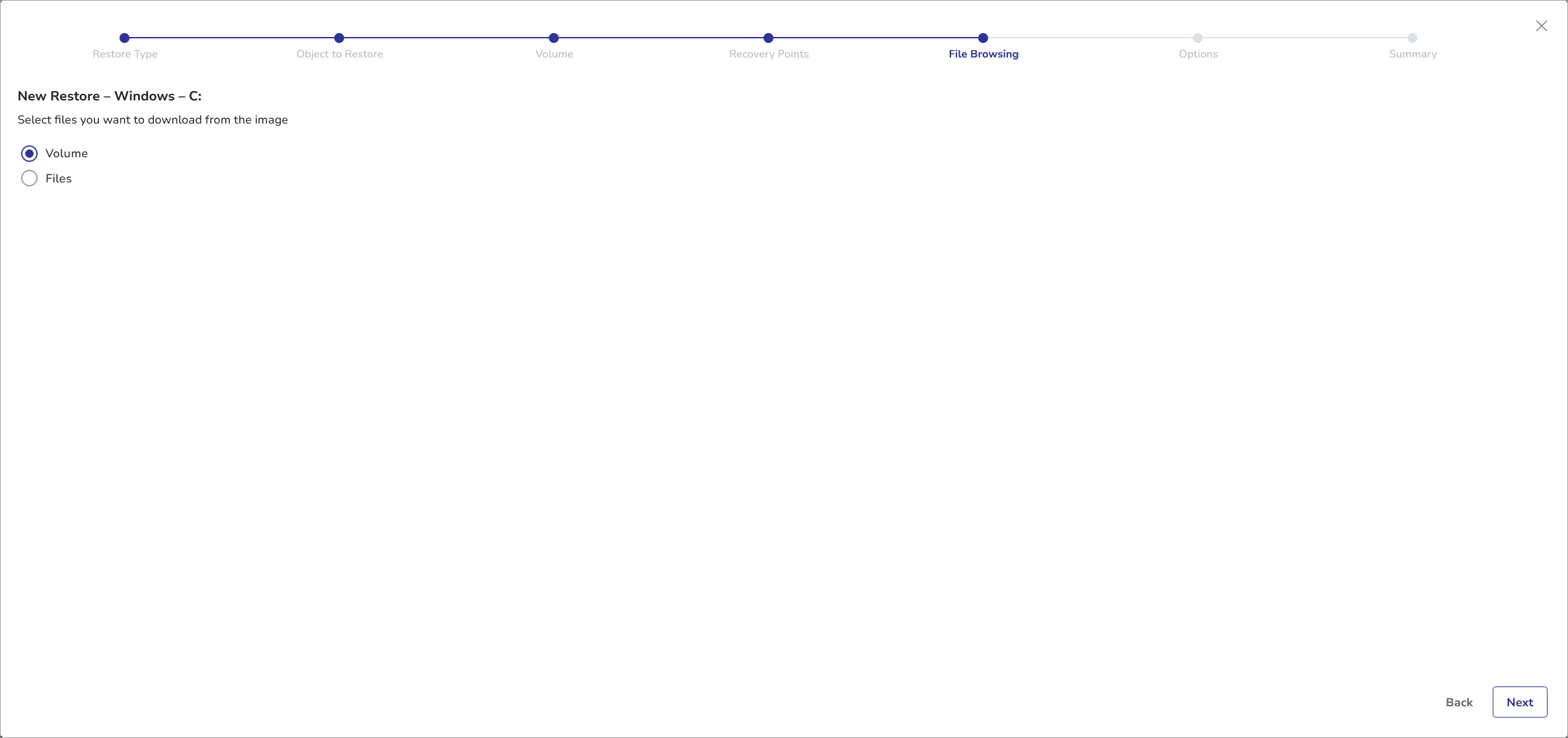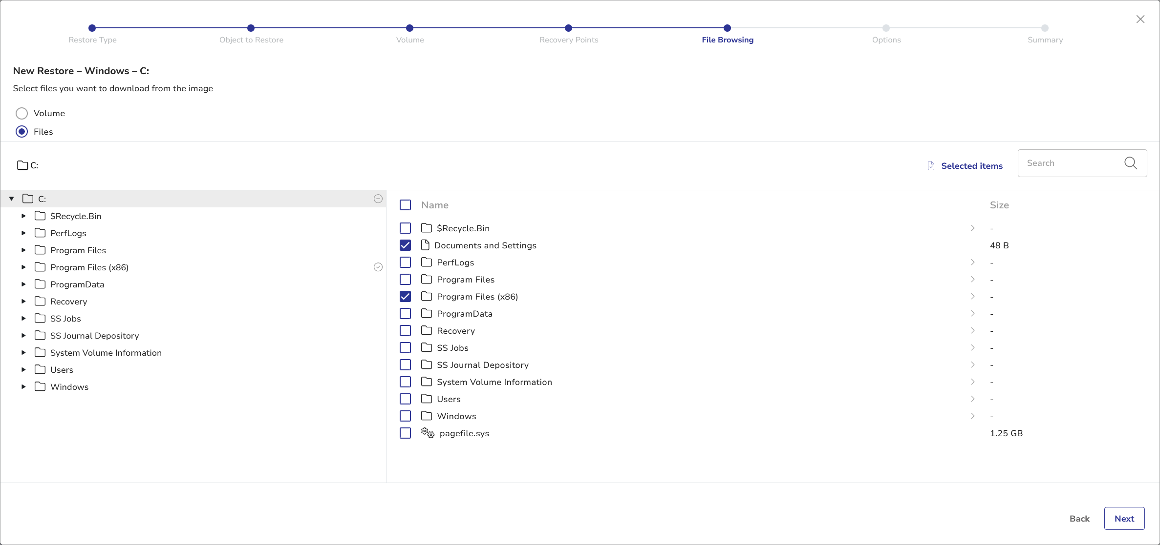 - In the File Browsing step, select either the entire Volume or specific files.