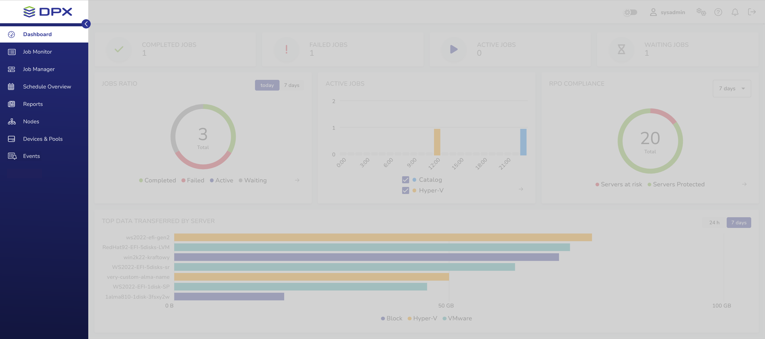 After successful login, the DPX dashboard is shown. Its main part presents an overview of the DPX’s performance.
