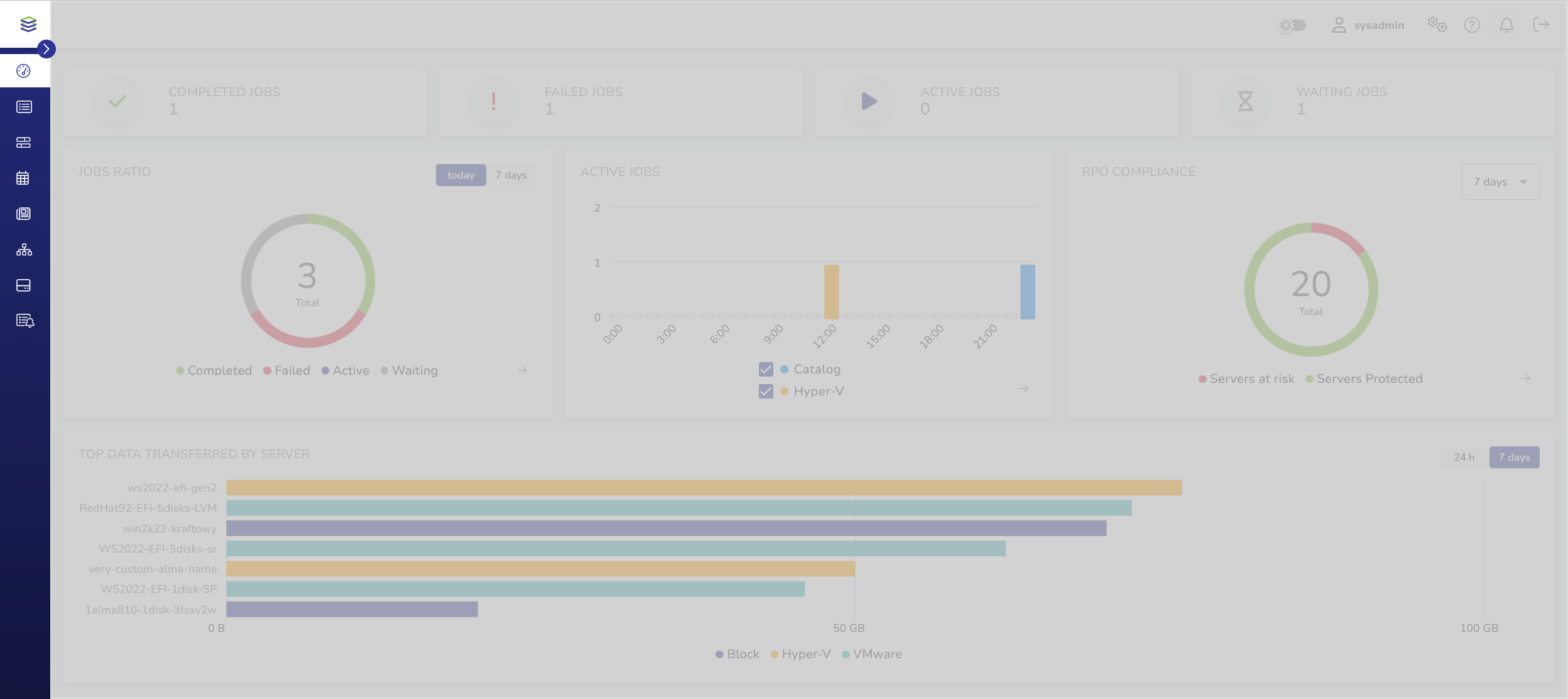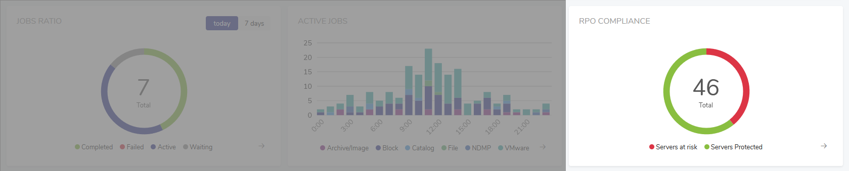 This widget shows the proportion of protected and unprotected nodes based on the RPO Compliance Report from the last 7 days. The arrow in the lower right corner will take you to the RPO Compliance Report in the Reports section.