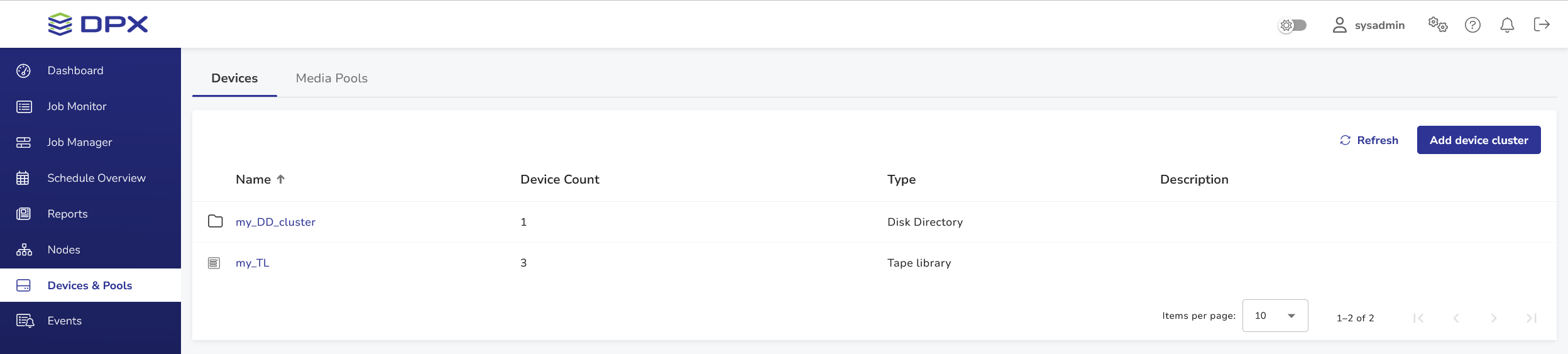 Storage devices (also simply referred to as “devices”) are physical or virtual drives on which media volumes, such as tape cartridges, are processed. Devices are grouped in clusters.