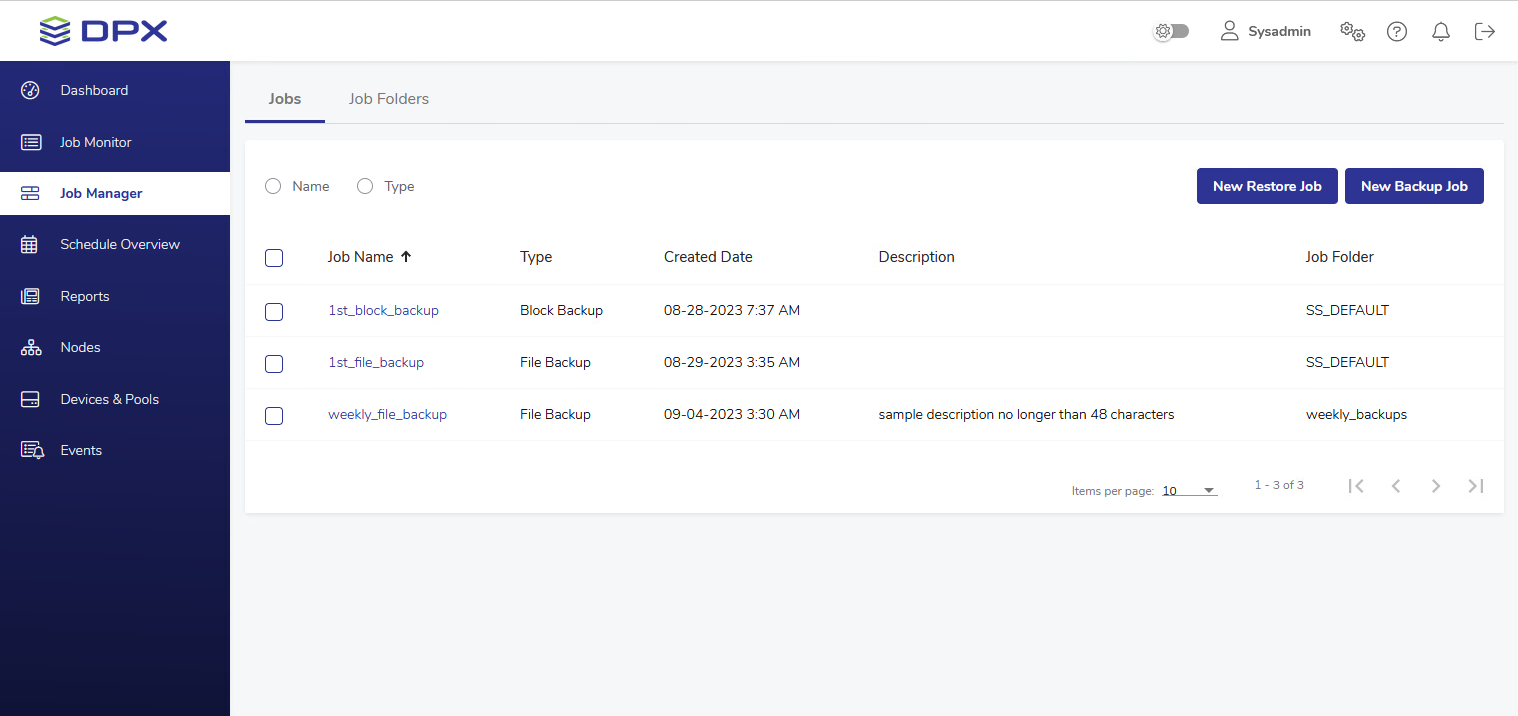 When you first run your DPX, this view is empty. Create new backup or restore jobs, using the New Backup Job or New Restore Job button respectively.