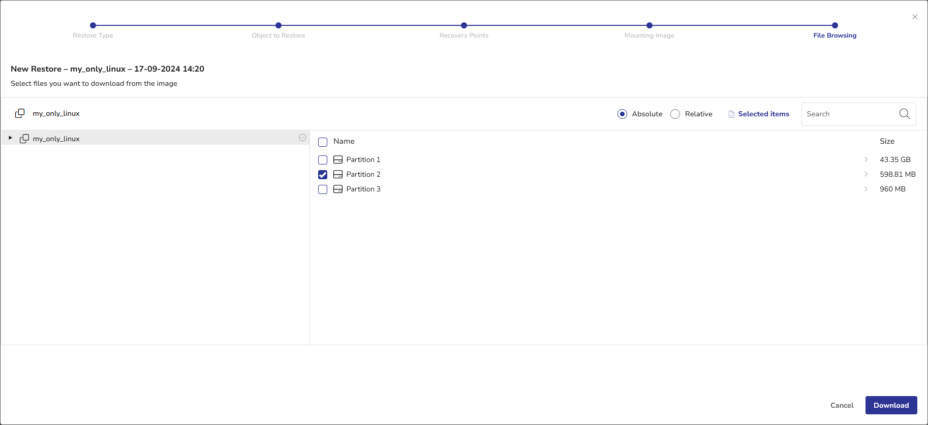 The Browse button [x] or the Browse option in the context menu under the right-click will take you to the final step of the Agentless File Restore workflow where you can select individual files or entire folders to restore. They will be downloaded as .zip archives to the machine you are using to connect to the web interface.