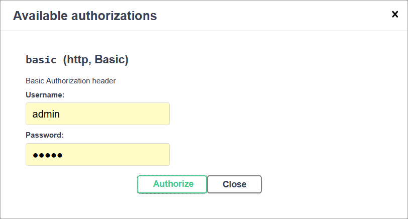 Each connection to Swagger requires authorization. This process requires credentials set up during installation: