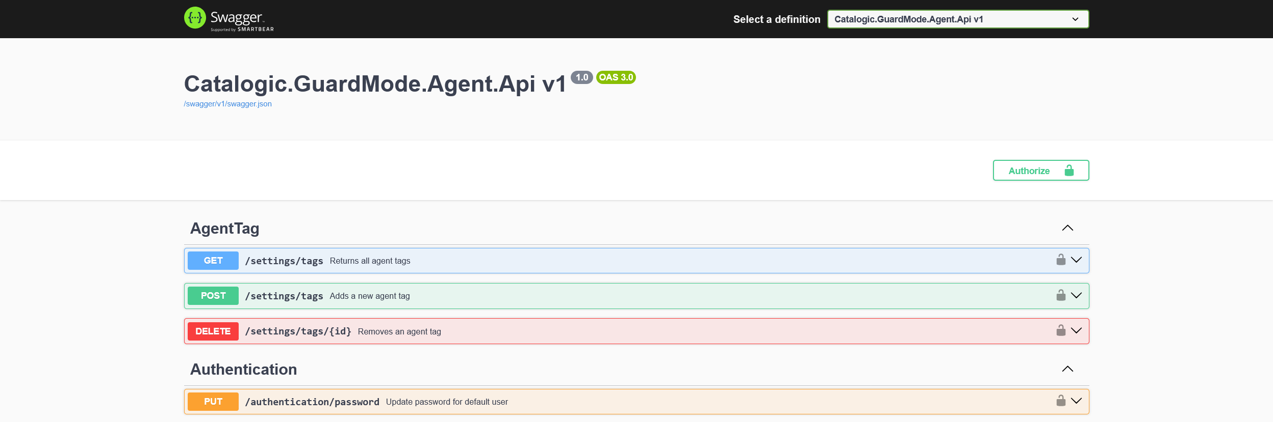 GuardMode provides an interactive Swagger (OpenAPI) interface that allows administrators to view available endpoints, inspect request and response formats, and execute API calls directly from a browser. This simplifies the process of testing configuration and integrating GuardMode into automated workflows.