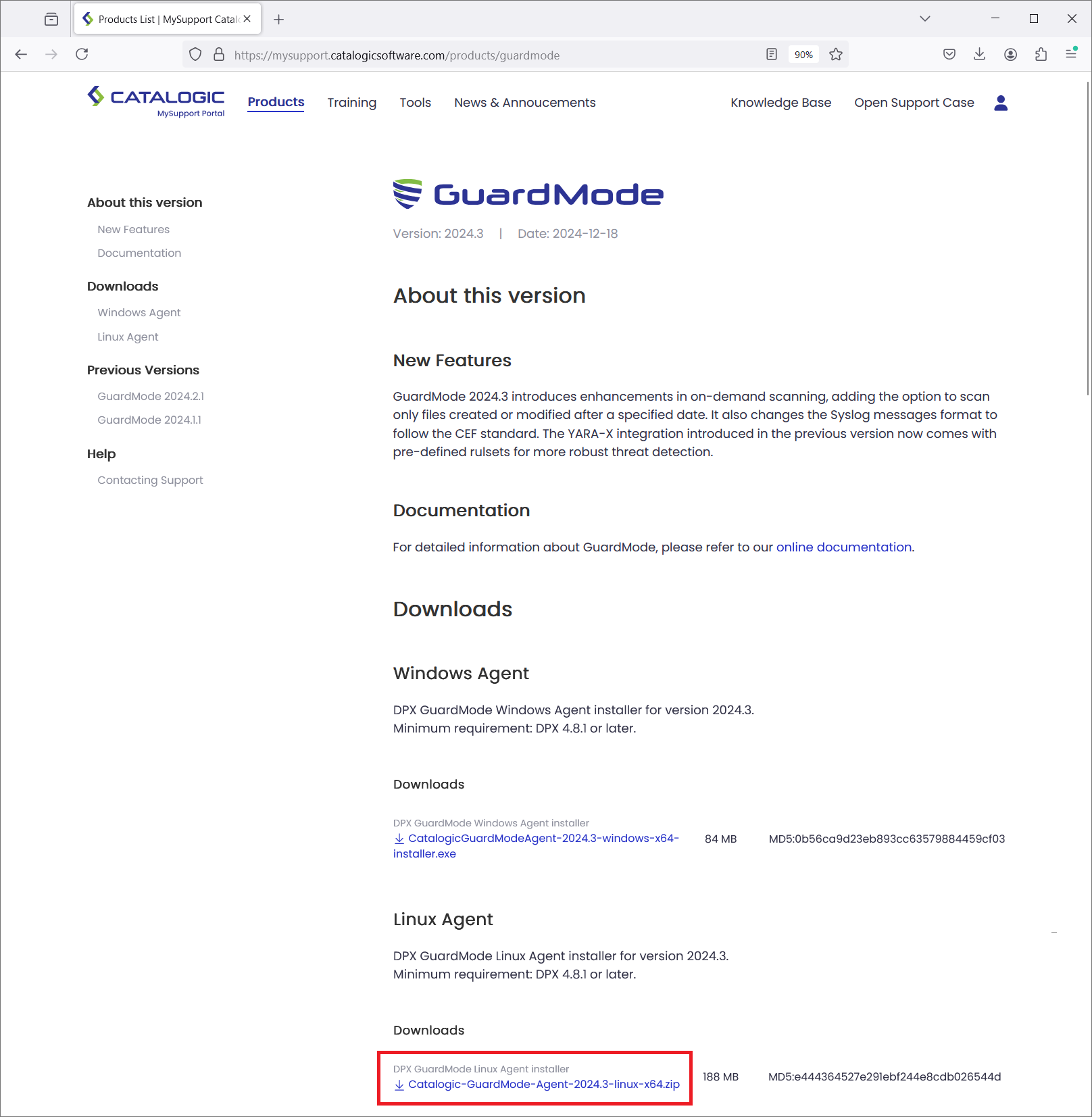 Go to the Catalogic MySupport website. Select the latest version of GuardMode Agent and click the installer download link.