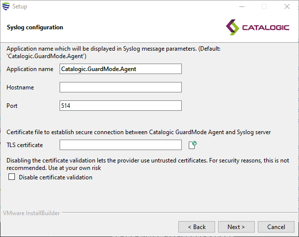 .\Catalogic.GuardMode.Agent config add notification-provider syslog --hostname "{hostname}" --port "{port}" --validate-tls-certificate "{validate_certificate}" --tls-enabled "{use_tls}" --tls-certificate-path "{certificate_path}" --application-name "{app_name}"
