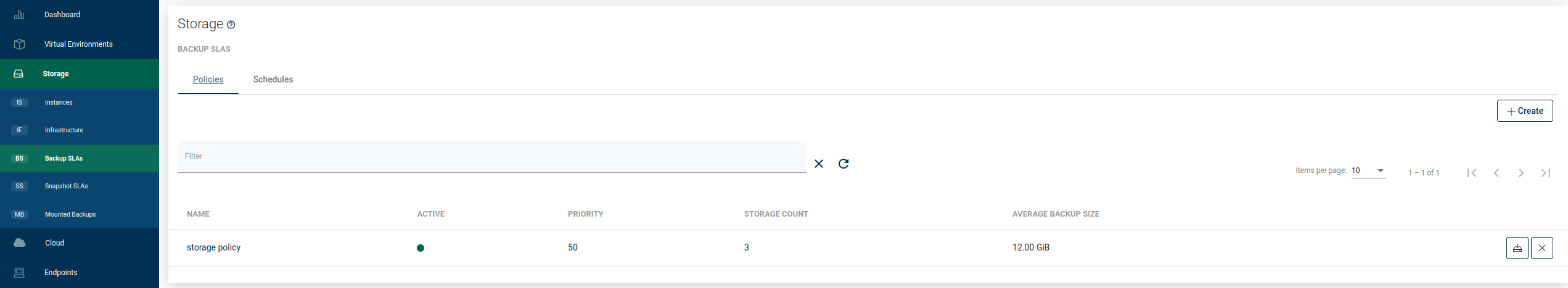 To create a new backup policy, open the Backup SLAs tab under the Storage Provider section and click on the Create button on the right.