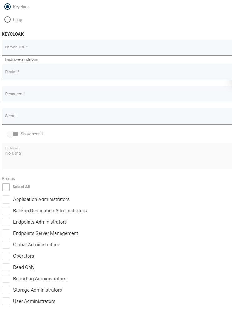 • Server URL - Keycloak server URL (if you want to use fqdn of server url you need to use DNS on Server machine or add line in /etc/hosts, for example: '1.2.3.4 dc.fqdn.address')