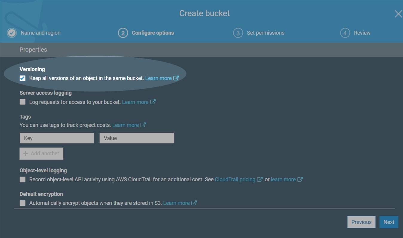 vPlus can store backups in AWS S3 or S3-compatible backup providers. In most cases, you just need to prepare a bucket (with versioning enabled if possible) and generate an access/secret key for vPlus. vPlus can be installed in AWS (if EC2 backup is used), but in most cases, S3 is used just as a cloud backup provider for on-prem environments.
