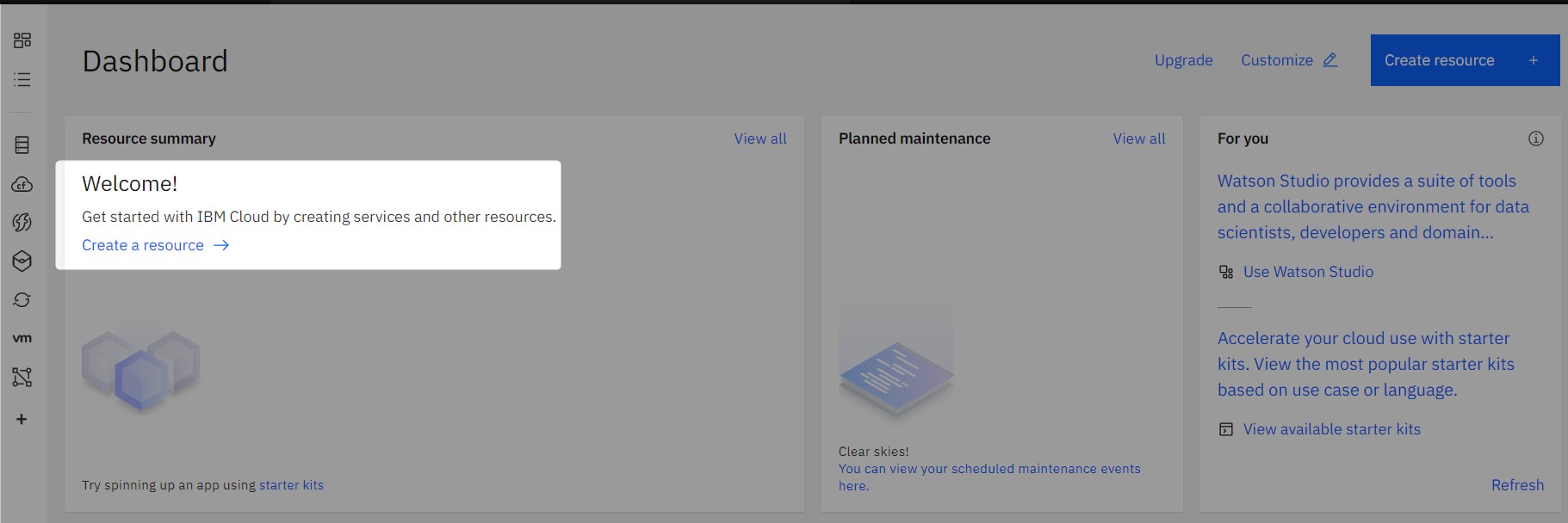 Log in to your IBM Cloud account. On the main dashboard, you will see the "Create a resource" button - Click on it.