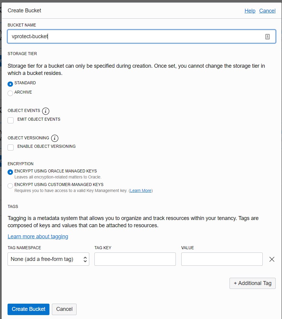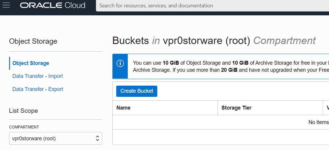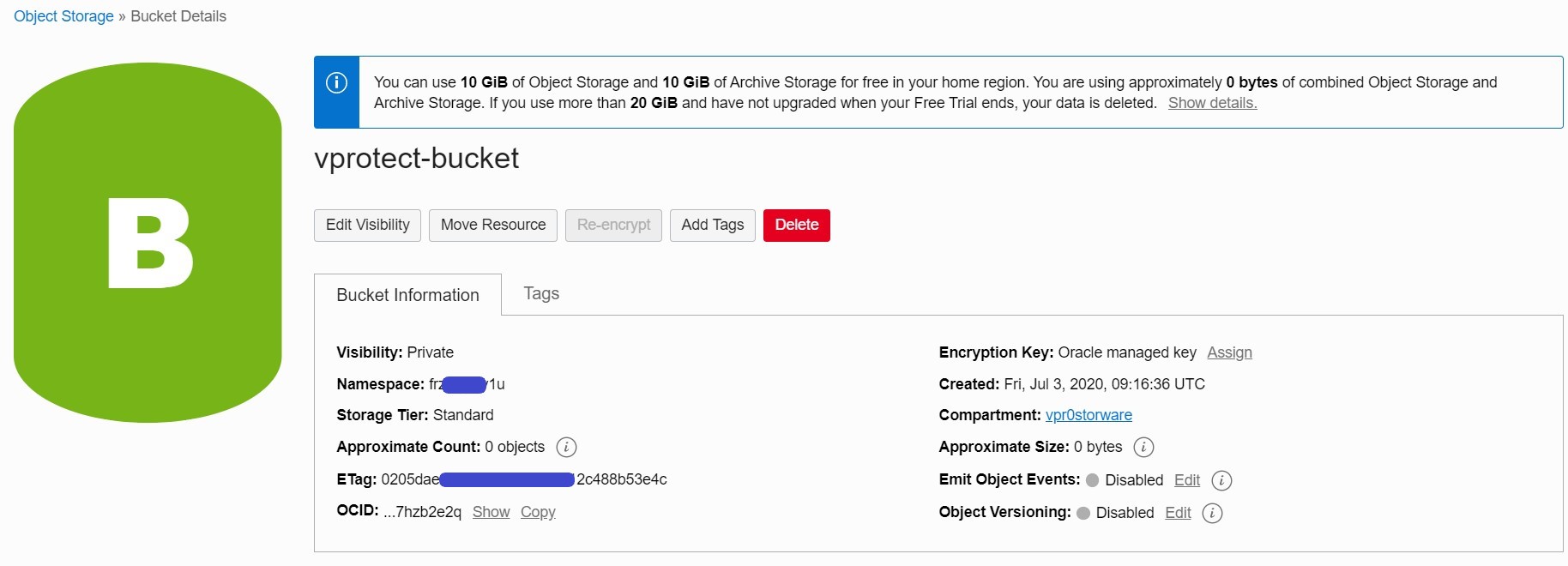After creating the bucket, you'll see a list of buckets. Click on the name to view the details of the object. Remember the namespace, we also need it when creating a backup destination.